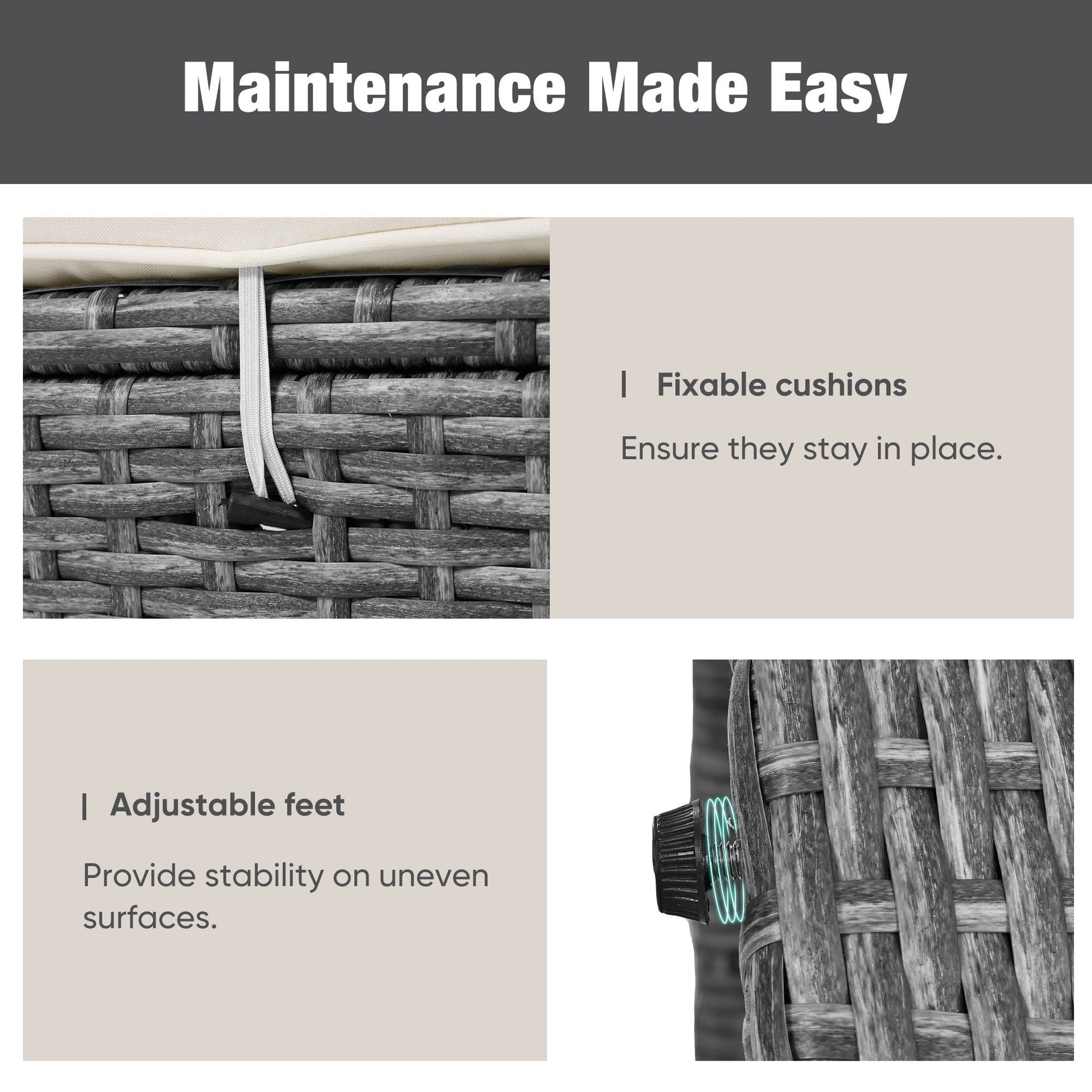 The centerpiece of this rattan sofa set is a round, liftable table with a wooden tabletop that doubles as an extra seating option thanks to its included cushion. This multi-functional table can be lifted to suit your needs.